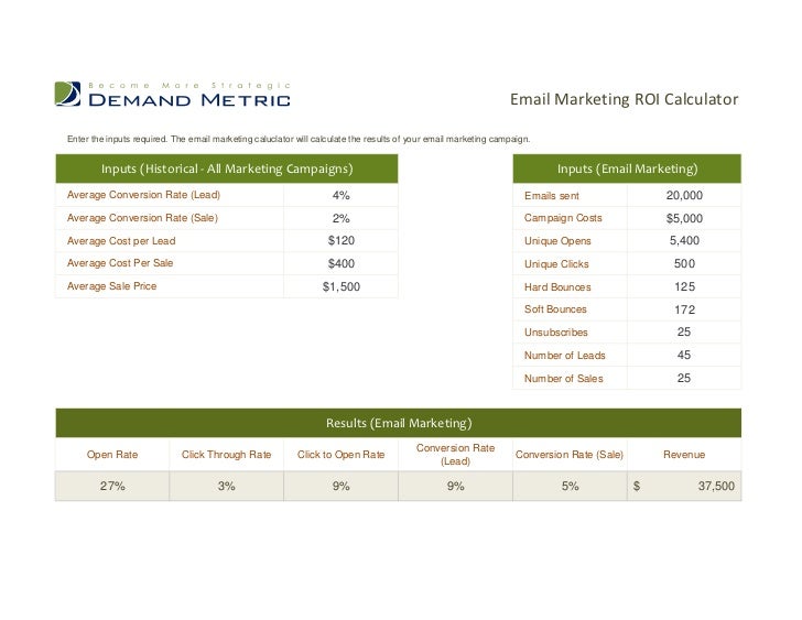Return on investment ROI Campaign costs Campaign profit / -loss Conversions Conversion rate Number of conversions Campaign cost per conversion Income from each conversion Total income from conversions Email Marketing ROI Calculator Email Campaign Number of emails sent Opened Click through Open ... Fetch Full Source
