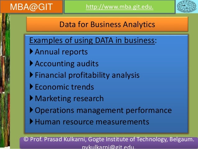 Business Analytics Syllabus Course Description Business analytics is applied in operations, marketing, finance, and strategic planning among other functions. The ability to use dataeffectivelytodriverapid, preciseandprofitabledecisionshasbeenacriticalstrategicadvantage ... Visit Document
