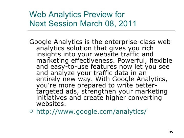 3 • Site Content & Landing Pages • Site Search • Events • Experiments • In-Page analytics Conversion Reports: Did they do what we wanted? • Goals • Ecommerce ... Return Document