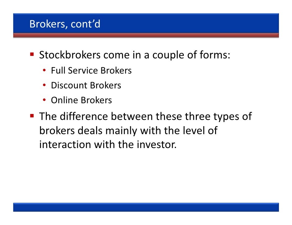 Types of investment brokers. Discount broker; Prime brokerage; Online broker; Brokerage activity is carried out by a broker who is a professional securities market participant. the stock is to be sold if its price falls below a stipulated level. ... Read Article